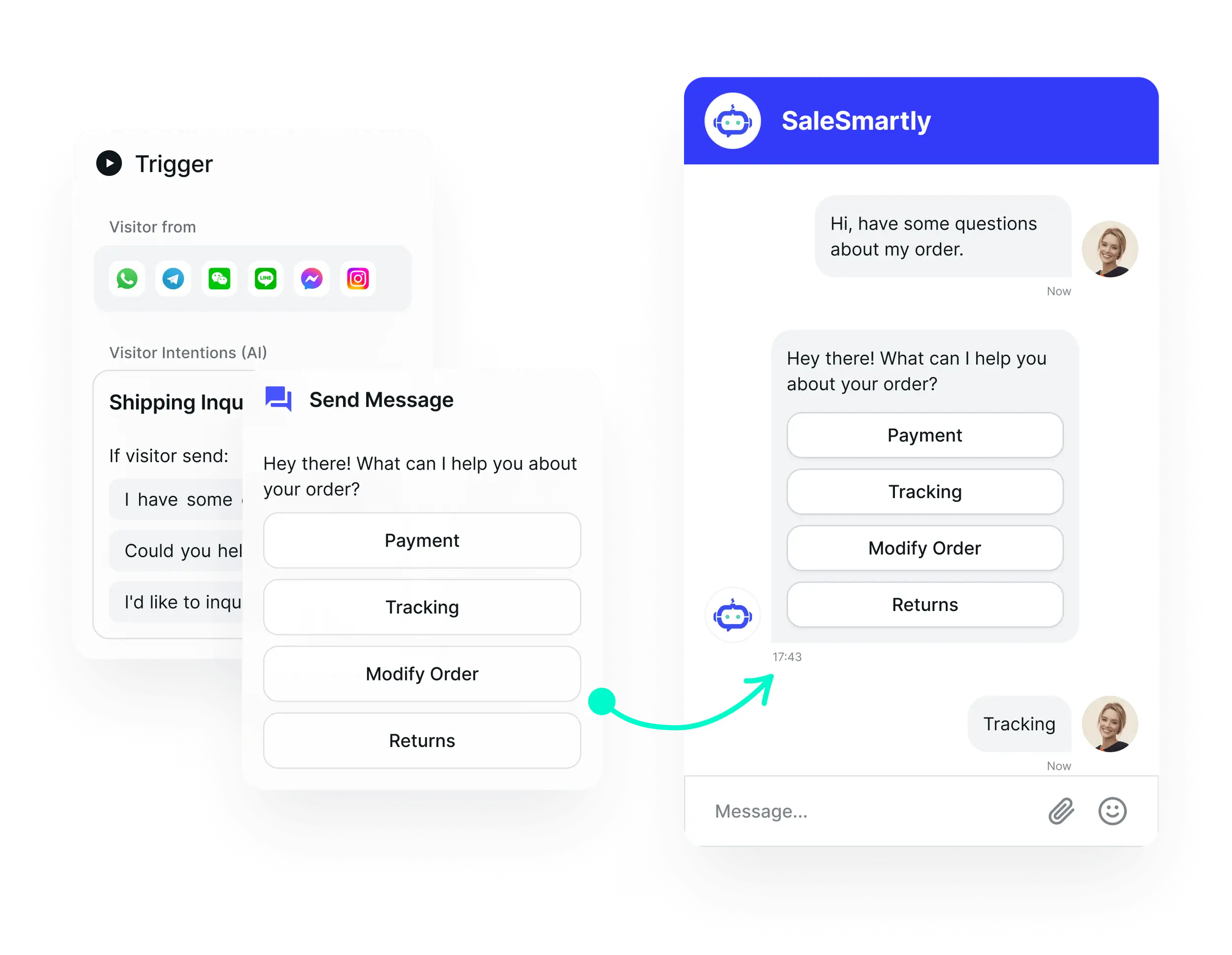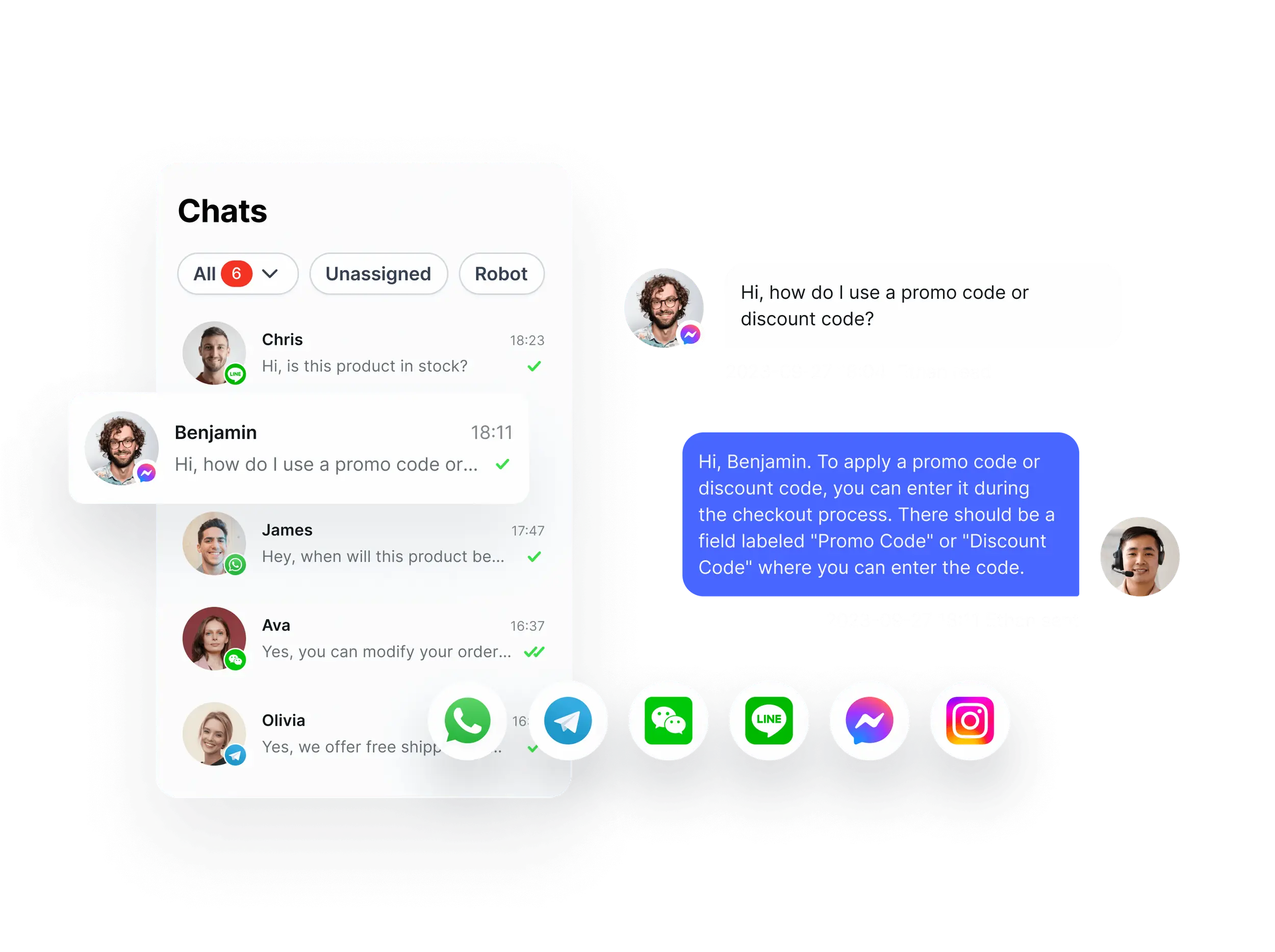 Seamlessly sell, market or service via Livechat, WhatsApp, Facebook Messenger, TikTok, Instagram, Telegram, Line, Email, VKontakte, WeChat, etc. for a unified customer experience